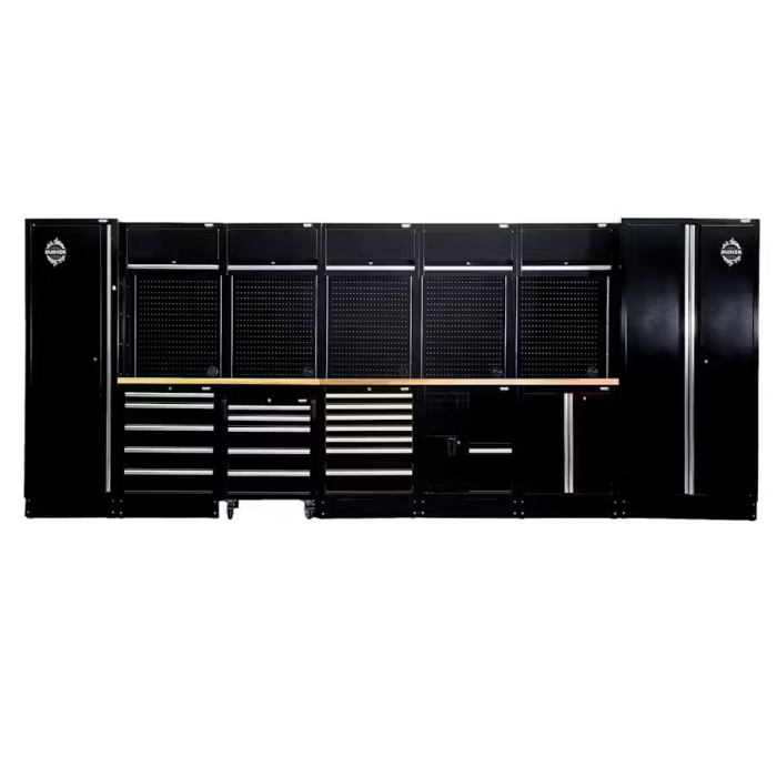 De modulaire opbergcombinatie van 4915 mm is voorzien van een werkblad van roestvrij staal of hardhout, samen met een selectie van stijlvolle vloerkasten, wandkasten, pegboard-panelen en beugels. De modulaire opbergsystemen van BUNKER® zijn ontworpen met het oog op duurzaamheid en bieden kwaliteit en slimme functies die het opbergen en organiseren van gereedschap vereenvoudigen, waardoor uw werkdag efficiënter verloopt.