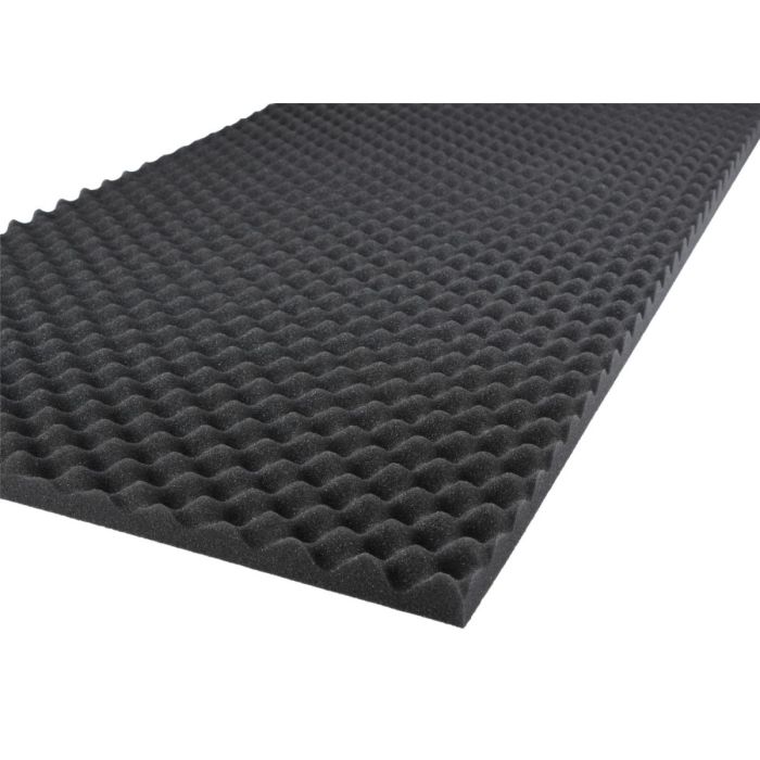 Noppenschuimplaat verpakt met een winkelbijsluiter. Door de noppenvorm worden de geluidsgolven geabsorbeerd. Beste resultaat wordt bereikt wanneer de noppen richting de geluidsbron worden gericht. De noppenplaat heeft een dikte van ongeveer 25 mm en een verpakking is 1 vierkante meter.